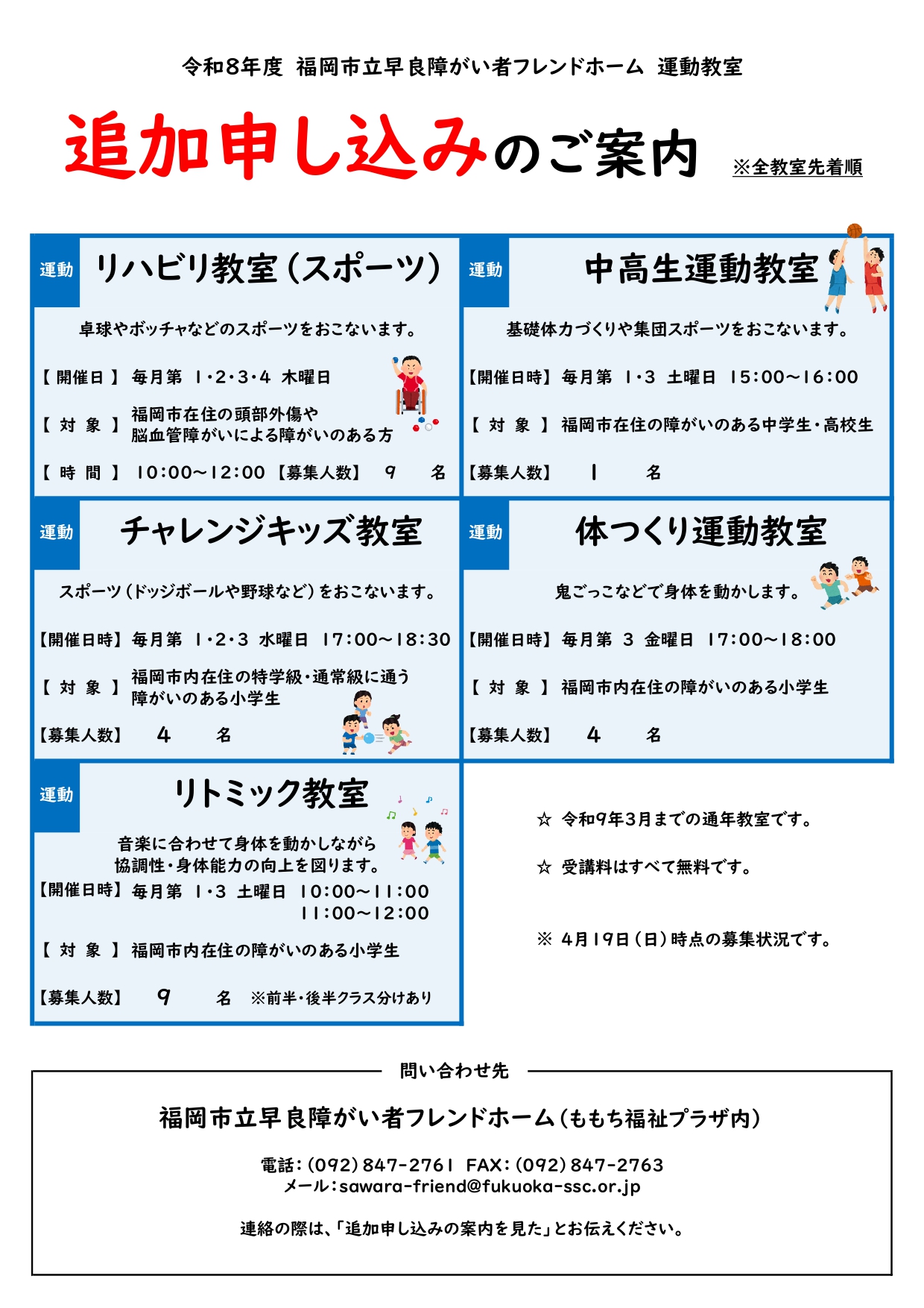 早良障がい者フレンドホームでは、 4月より主催教室(運動・文化教室)が開講しています。 先日、5・6月開講教室の受付が終了しましたが、 教室によって若干名空きがあるため、追加申込を受け付けます。 追記 【文化】「絵画教室 … 続きを読む 令和8年度 主催教室(追加募集について)