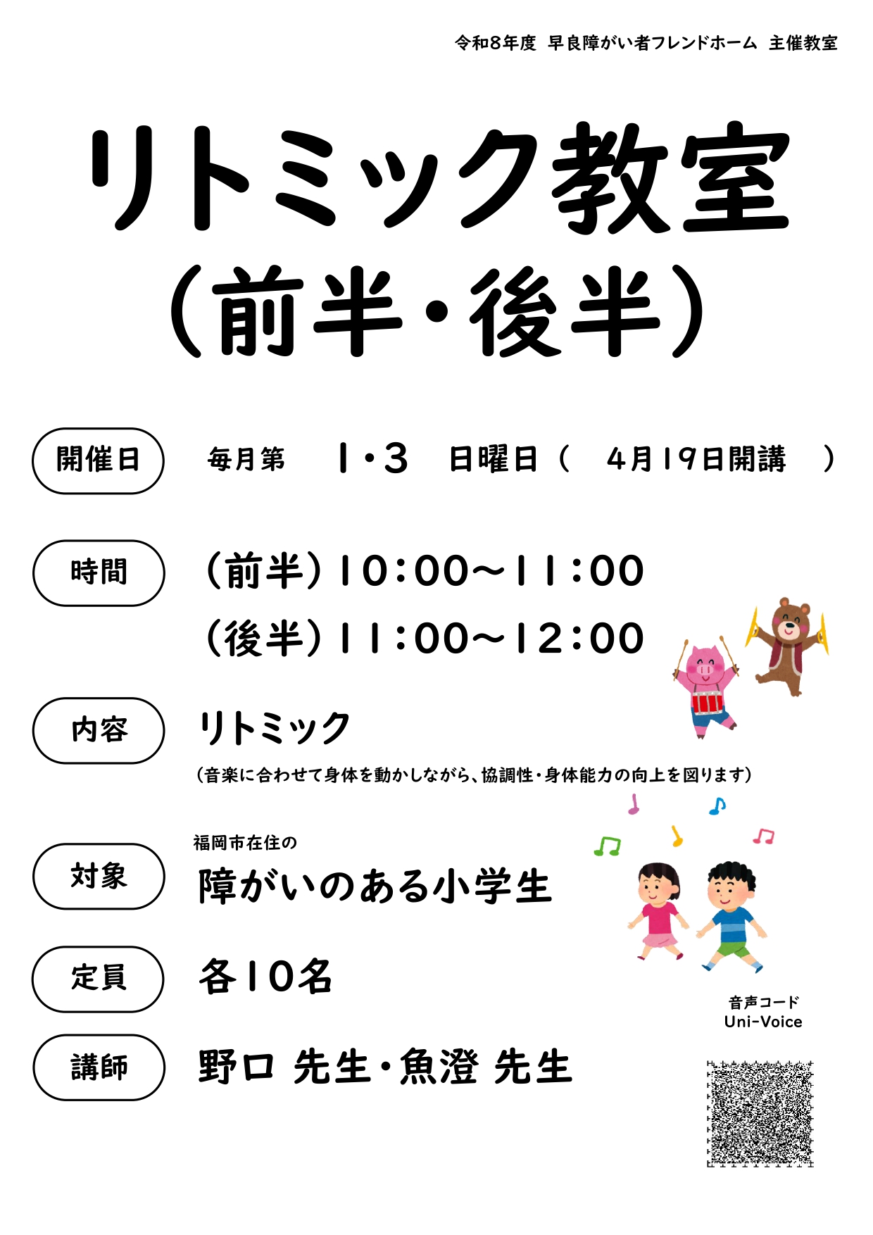 申込期間は 令和8年2月15日(日)~3月1日(日)まで ・・・・・・・・・・・・・・・・・・・・・・☆開館日☆ 火曜日~日曜日 ※最終日曜日は休館日 ☆電 話☆ 092-847-2761 ☆FAX☆ 092 … 続きを読む 令和8年度 リトミック教室のご案内
