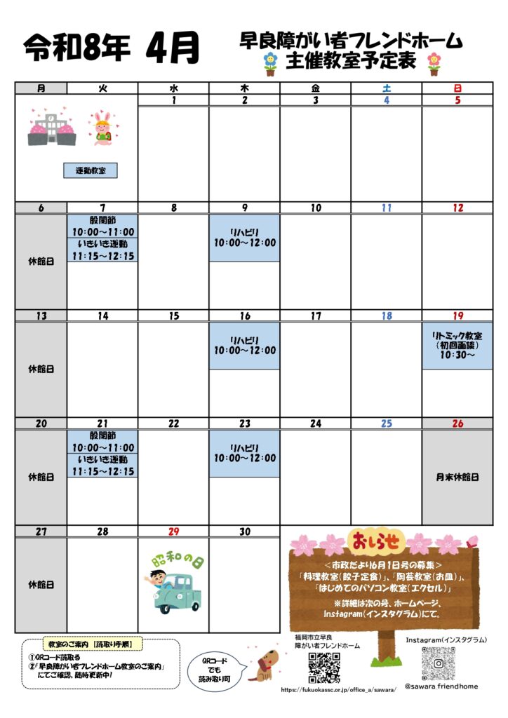 令和8年度)4月:教室カレンダー
